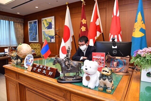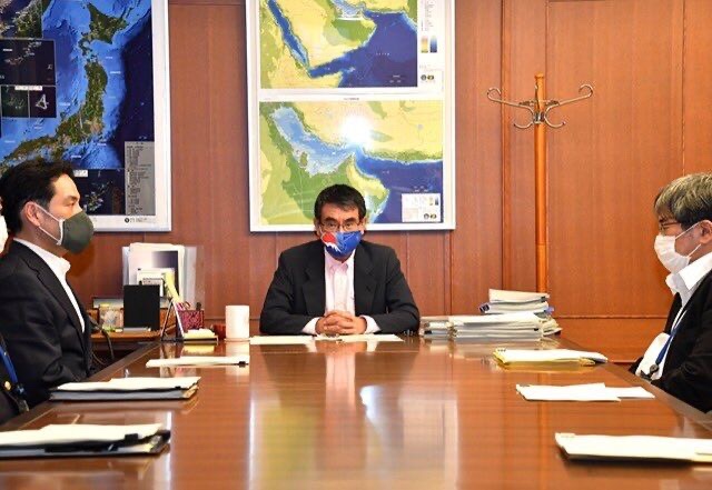 河野防衛相は先月19日、ツイッターを通じてインドネシアとシンガポールの防衛相と電話会談をしたという内容を掲載し、執務室で通話している本人の写真を掲載した。写真の後ろには旭日旗が置かれた上に、執務室の片隅に韓半島の地図がかかっていて、議論が起きた。